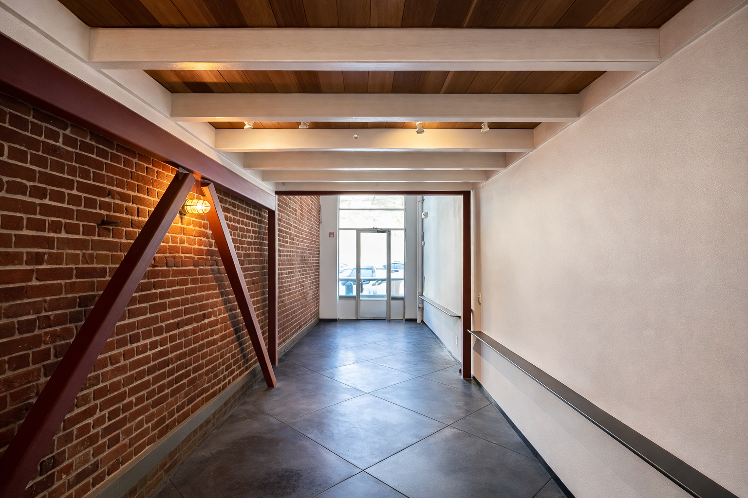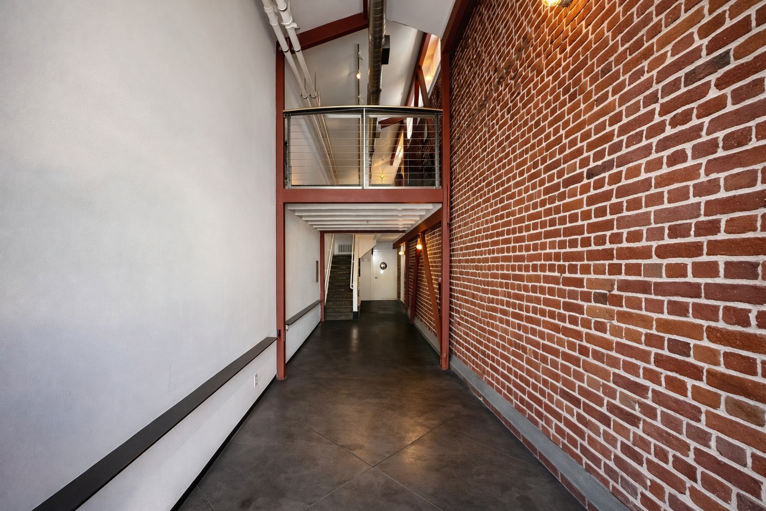 Exposed brick, steel, and concrete architectural details.